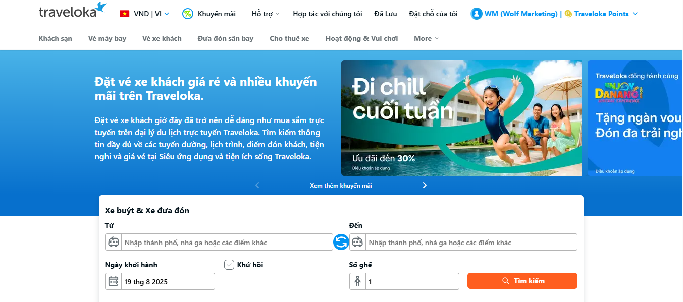 Traveloka là nền tảng du lịch hàng đầu Đông Nam Á, cho phép người dùng khám phá, đặt và tận hưởng đa dạng các sản phẩm du lịch. Nền tảng này cung cấp các lựa chọn di chuyển bao gồm máy bay, xe buýt, tàu hỏa, thuê xe và đưa đón sân bay.